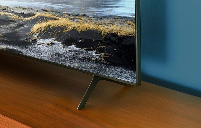 Seria TU8002 odznacza się podstawą Slim Feet (“wąskie stopy”). Chodzi o to, że telewizor ma dwie nóżki (tzw. stopki) umiejscowione przy końcach matrycy. Szkoda, że zrezygnowano z podstawy o nazwie V-type Center Low, która odróżniała w zeszłym roku modele z nieco wyższej serii (Samsung RU7472) od serii podstawowej (RU7102). Dla pocieszenia dodajmy, że modele z jeszcze wyższej serii (TU8502) mają zupełnie inną podstawkę – bardziej elegancką.