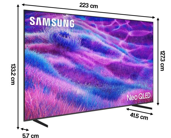 100-calowy Samsung QE100QN80FU prezentuje nowoczesny, minimalistyczny design Simple Chamfer w kolorze czarno-srebrnym. Telewizor można postawić na nóżkach lub zawiesić na ścianie zgodnie z standardem VESA 600×400 mm. Wymiary samego ekranu to 222,3 x 127,3 x 5,7 cm, a waga z podstawą wynosi 60,3 kg. Opakowanie i transport tego modelu również zostały przemyślane – waży 78 kg i ma wymiary 239 x 24 x 145 cm.