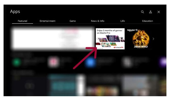 Krok 1. W telewizorze LG wejdź na stronę główną aplikacji LG Content Store, a następnie kliknij baner promocyjny.